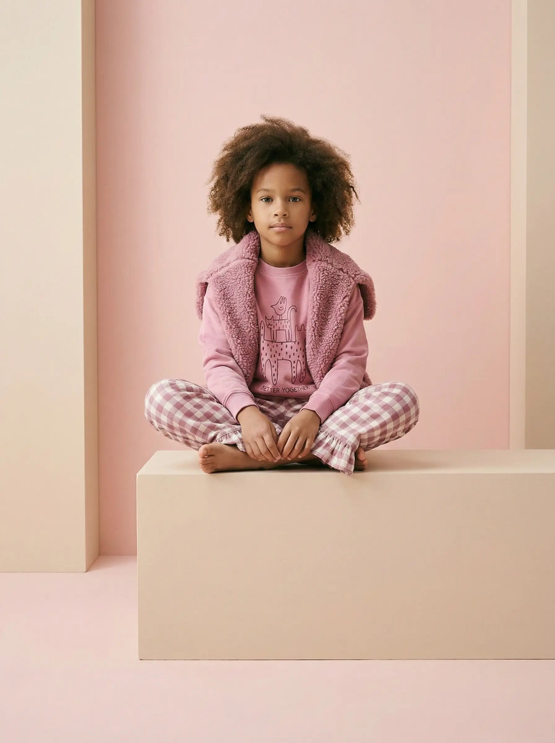 A comfortable and soft pink longsleeve with pink trim at the neckline. A charming graphic on the front adds a cheerful, childlike touch.